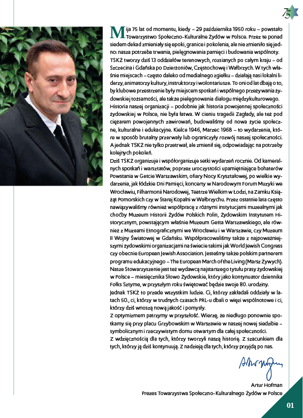 Rok 2025 jest dla Towarzystwa Społeczno-Kulturalnego Żydów w Polsce czasem szczególnym – świętujemy 75-lecie istnienia organizacji, która od 1950 roku pozostaje sercem i głosem społeczności żydowskiej w Polsce. Nasze stowarzyszenie, nieprzerwanie od siedmiu i pół dekady, działa na rzecz zachowania dziedzictwa kulturowego, wspierania integracji, przeciwdziałania uprzedzeniom i rozwijania dialogu polsko-żydowskiego. Nasz jubileusz stanowi okazję do uhonorowania tej wielowymiarowej działalności – zarówno poprzez refleksję nad przeszłością, jak i spojrzenie w przyszłość.