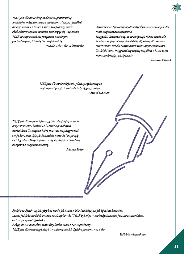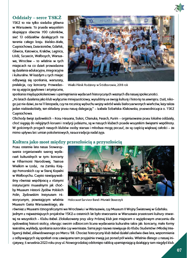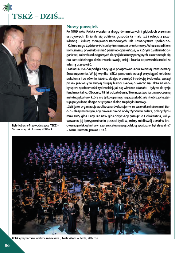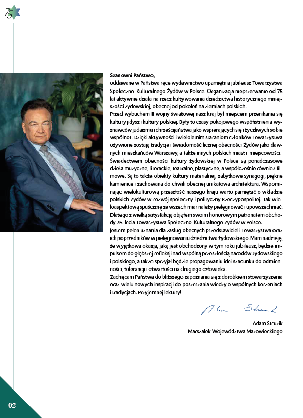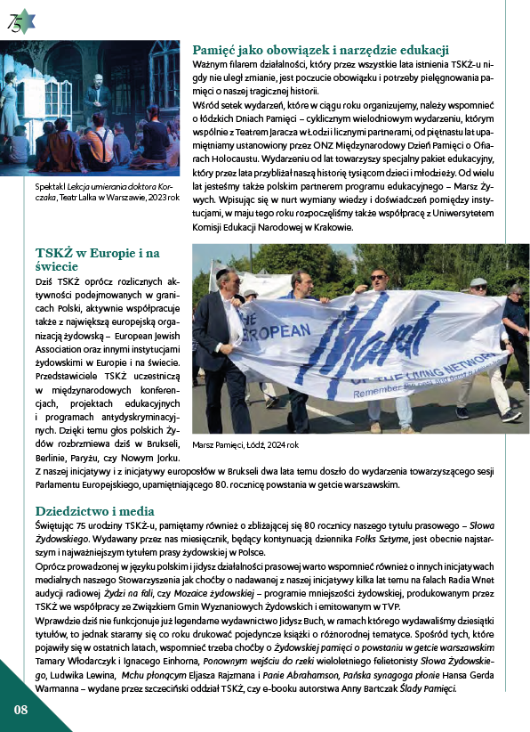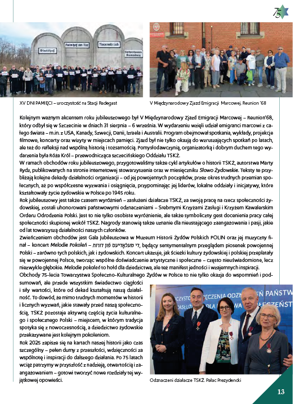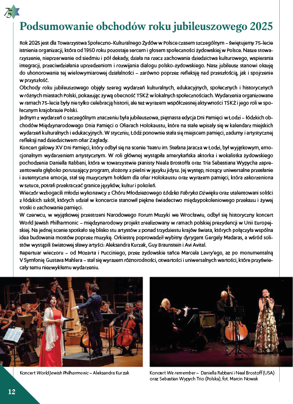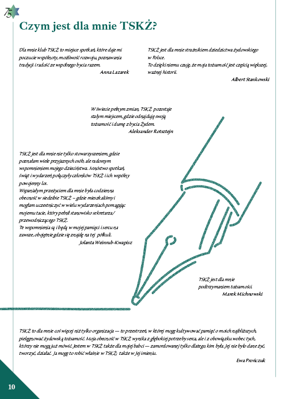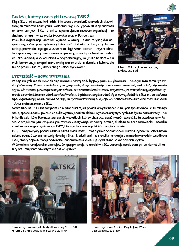 Obchody 75-lecia Towarzystwa Społeczno-Kulturalnego Żydów w Polsce to nie tylko okazja do wspomnień i podsumowań, ale przede wszystkim świadectwo ciągłości i siły wartości, które od dekad kształtują naszą działalność. To dowód, że mimo trudnych momentów w historii i licznych wyzwań, jakie stawały przed naszą społecznością, TSKŻ pozostaje aktywną częścią życia kulturalnego i społecznego Polski – miejscem, w którym tradycja spotyka się z nowoczesnością, a dziedzictwo żydowskie przekazywane jest kolejnym pokoleniom.