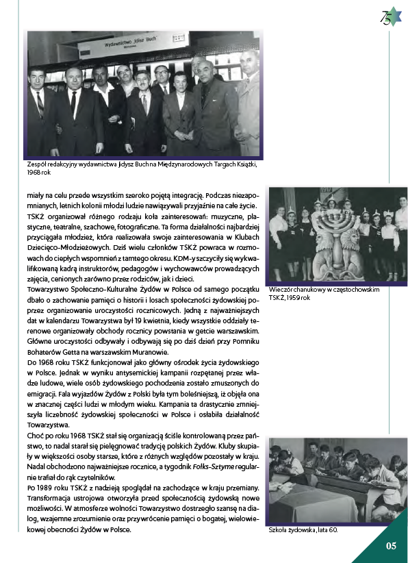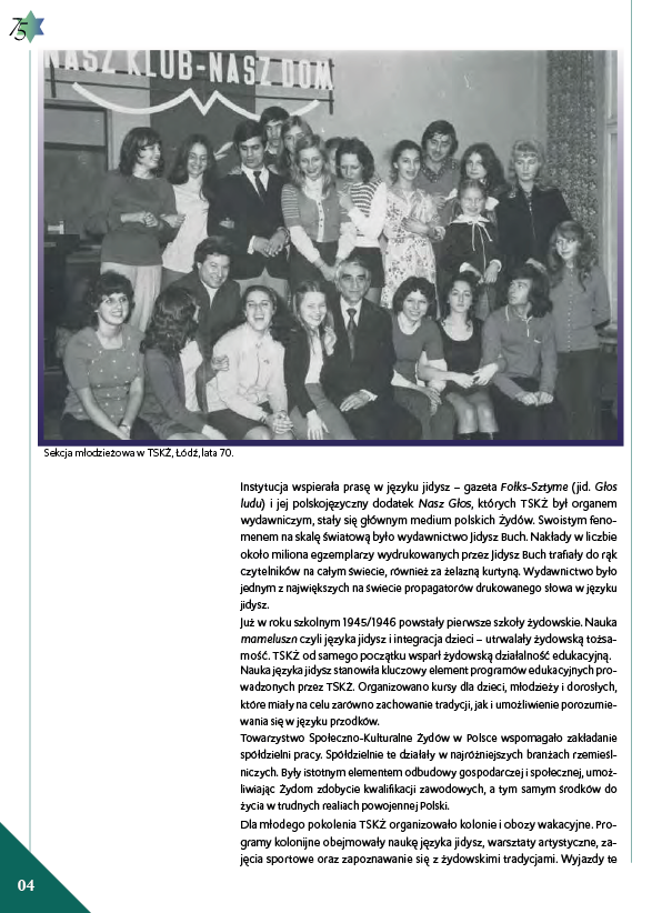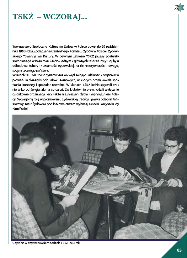 W ramach obchodów roku jubileuszowego, przygotowaliśmy także cykl artykułów o historii TSKŻ autorstwa Marty Rydz, publikowanych na stronie internetowej stowarzyszenia oraz w miesięczniku „Słowo Żydowskie”. Teksty te przybliżają kolejne dekady działalności organizacji - od jej powojennych początków, przez okres trudnych przemian społecznych, aż po współczesne wyzwania i osiągnięcia, przypominając jej liderów, lokalne oddziały i inicjatywy, które kształtowały życie żydowskie w Polsce po 1945 roku.