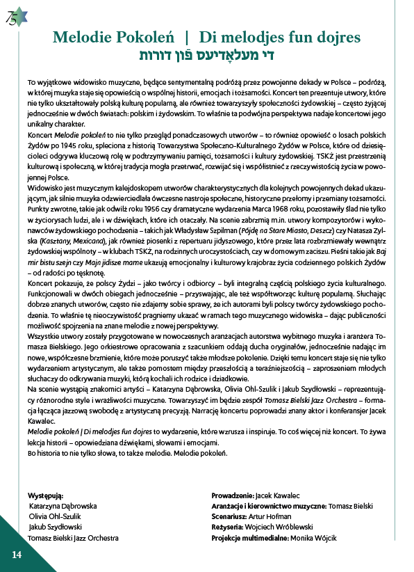 Zwieńczeniem obchodów jest Gala Jubileuszowa w Muzeum Historii Żydów Polskich POLIN oraz jej muzyczny finał – koncert „Melodie Pokoleń – די מעלאָדיעס פֿון דורות”, będący sentymentalnym przeglądem piosenek powojennej Polski – zarówno tych polskich, jak i żydowskich. Koncert ukazuje, jak ścieżki kultury żydowskiej i polskiej przeplatały się w powojennej Polsce, tworząc wspólne doświadczenie artystyczne i społeczne – często nieuświadomione, lecz niezwykle głębokie. „Melodie pokoleń” to hołd dla dziedzictwa, ale też manifest jedności i wzajemnych inspiracji.